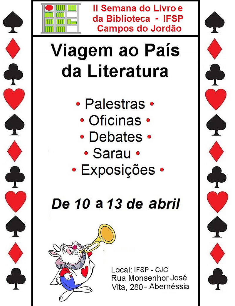 O Câmpus Campos do Jordão do Instituto Federal de Educação, Cide São Paulo realizou a II Semana do Livro e da Biblioteca, no período de 10 a 13 de abril de 2017. O evento apresentou uma programação cultural bem interessante, envolvente e dinâmica, centrada no tema “Viagem ao País da Literatura” e inspirada na fantástica obra “Alice no País das Maravilhas”, de Lewis Carrol. Foram realizados saraus, palestra, oficinas literárias, debates e exposições, com destaque para a leitura prazerosa, com o objetivo de despertar nos participantes o hábito da leitura. A Semana foi enriquecida com a cerimônia de descerramento da placa de denominação da Biblioteca que, por indicação da comunidade do câmpus, passou a se chamar Biblioteca Pedro Paulo Filho, em homenagem ao grande advogado, escritor e historiador de Campos do Jordão, falecido em 2014. Familiares e amigos do escritor estiveram presentes à homenagem. A equipe organizadora do evento aproveita para agradec
