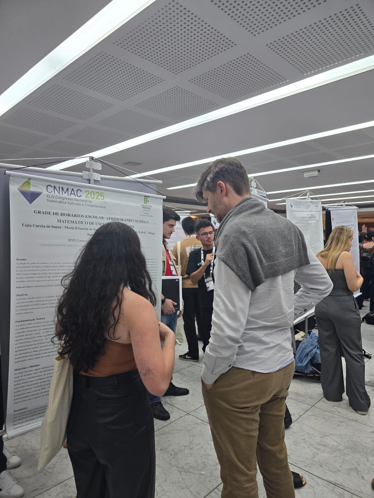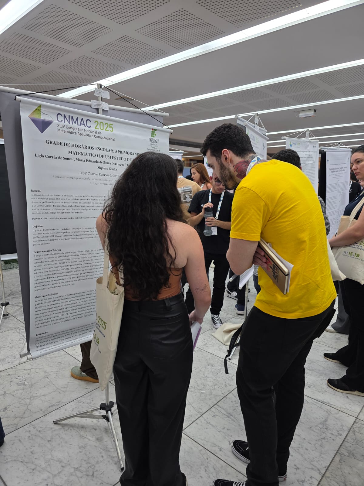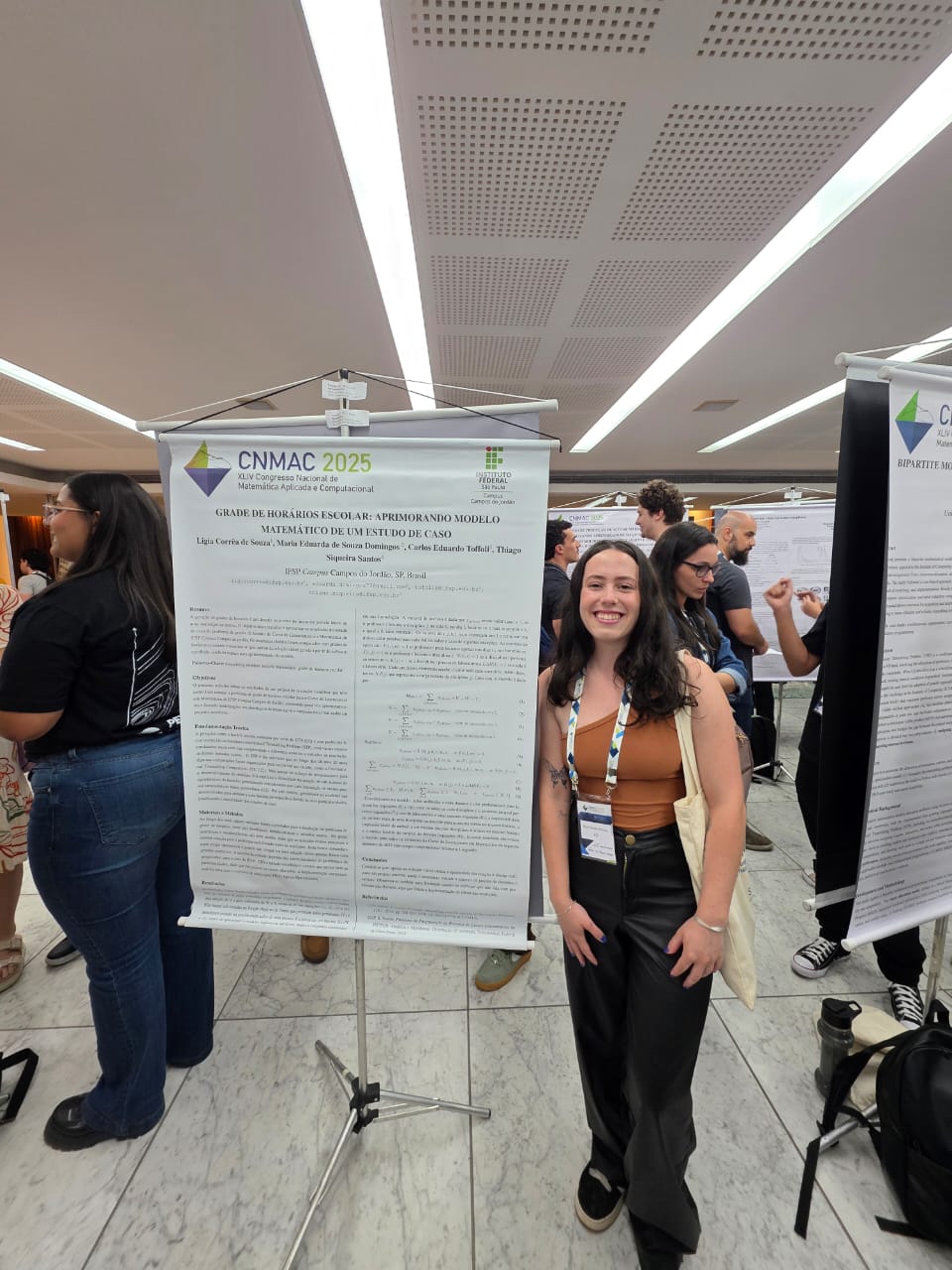 O ponto alto da participação discente ocorreu na quarta-feira, 17 de setembro, quando a aluna Maria Eduarda de Souza Domingos apresentou o pôster intitulado "Grade de Horários Escolar: Aprimorando Modelo Matemático de um Estudo de Caso".O trabalho, fruto de um projeto de iniciação científica orientado pela professora Ligia Corrêa de Souza com a colaboração dos professores Carlos Eduardo Toffoli e Thiago Siqueira Santos, foi socializado com a comunidade acadêmica nacional, recebendo contribuições valiosas de pesquisadores e participantes do congresso.