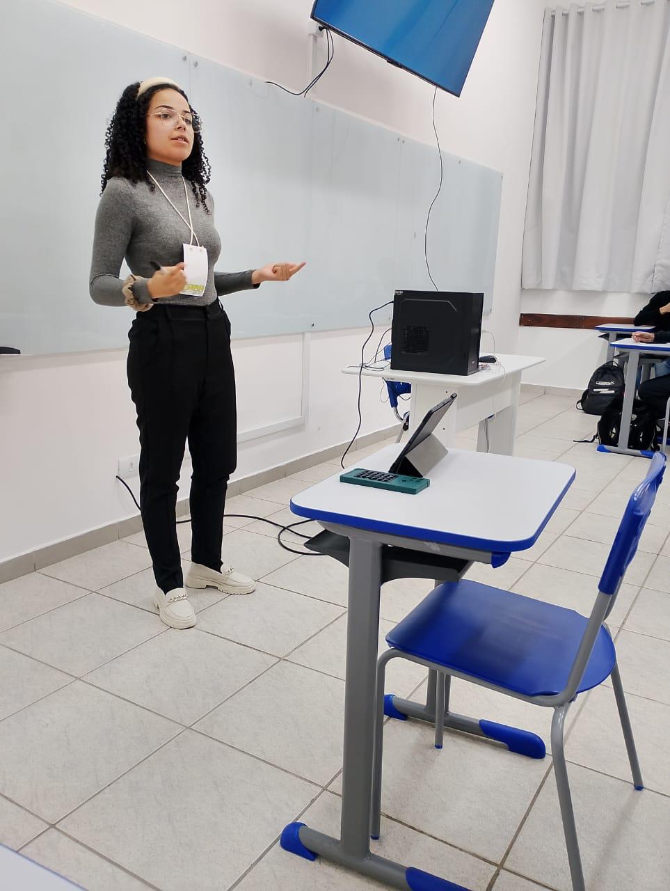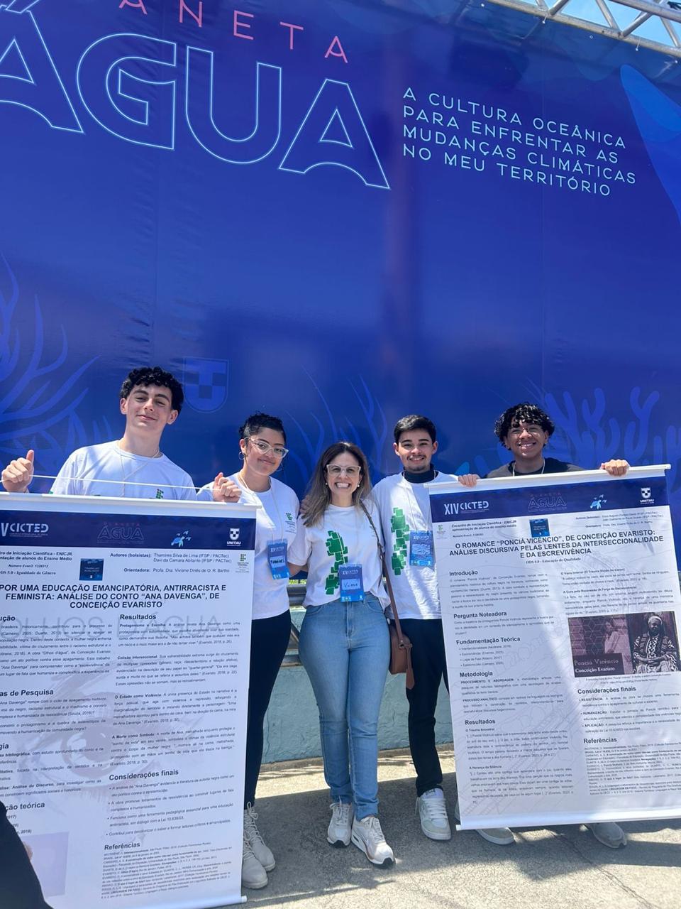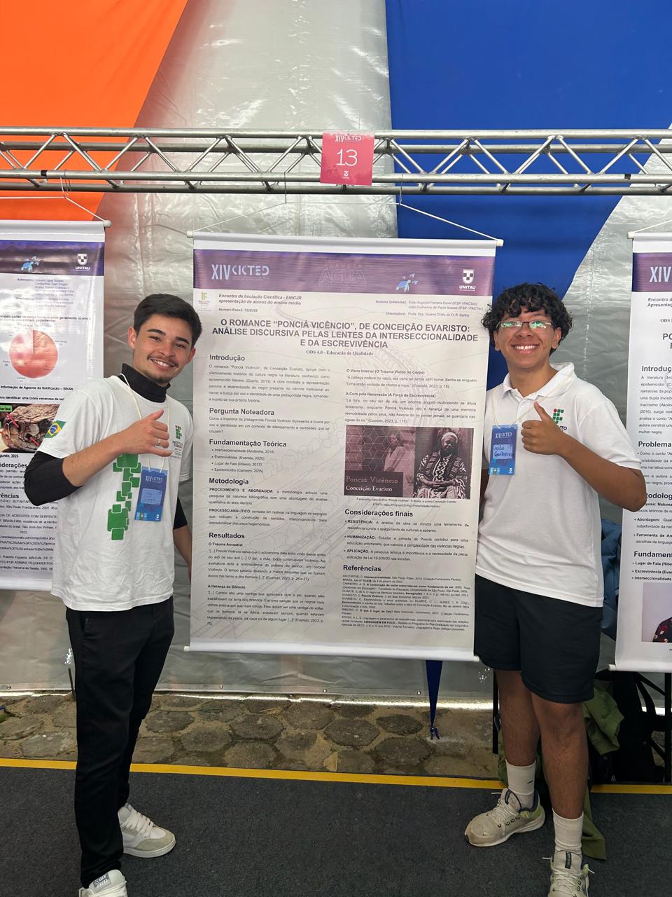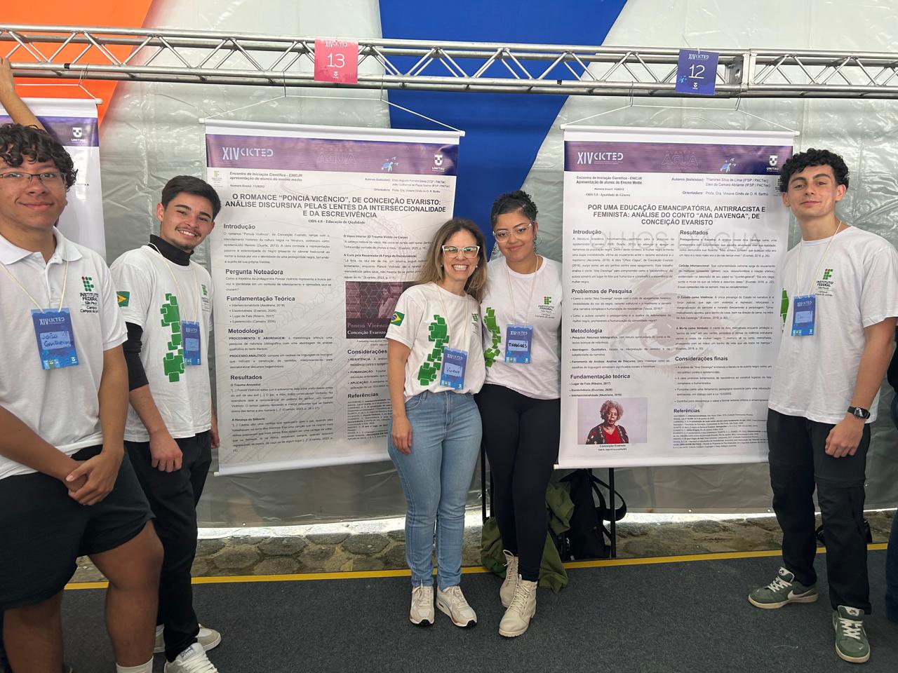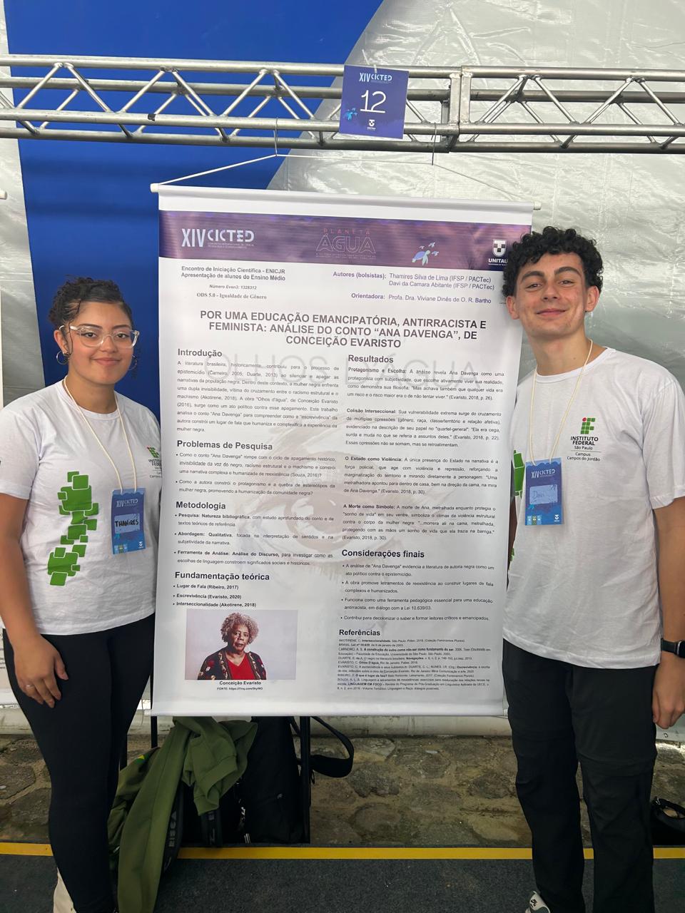 Os alunos Thamires Silva de Lima (3º ano do Integrado de Informática), Enzo Augusto Ferreira (3º ano do Integrado de Informática), Davi da Camara Abitante (1º ano do Integrado de Edificações) e João Guilherme de Paula Soares (1º ano do Integrado de Edificações) participaram do evento na modalidade pôster de Iniciação Científica de Alunos do Ensino Médio, sob a orientação da Profa. Dra. Viviane Dinês de O. R. Bartho. Os trabalhos apresentados foram resultantes de pesquisas fomentadas pelo Programa de Apoio à Ciência e Tecnologia do IFSP (PACTec), um projeto do IFSP gerido pela Fundação de Apoio Institucional ao Desenvolvimento Científico e Tecnológico – FAI.UFSCar. Os alunos Thamires e Davi apresentaram resultados parciais de pesquisa com o trabalho intitulado “Por uma educação emancipatória, antirracista e feminista: análise do conto ‘Ana Davenga’, de Conceição Evaristo”; e os alunos Enzo e João Guilherme discutiram resultados parciais com o trabalho de título “O romance ‘Ponciá Vicêncio’, de Conceição Evaristo: análise discursiva pelas lentes da interseccionalidade e da escrevivência”. Ambos os trabalhos buscam promover valorização da literatura negra, letramentos de reexistência e cumprimento da lei educacional brasileira 10.639/03, que inclui, no âmbito do currículo escolar nacional, a obrigatoriedade do estudo da História da África e dos africanos, a luta dos negros no Brasil e a cultura negra brasileira.