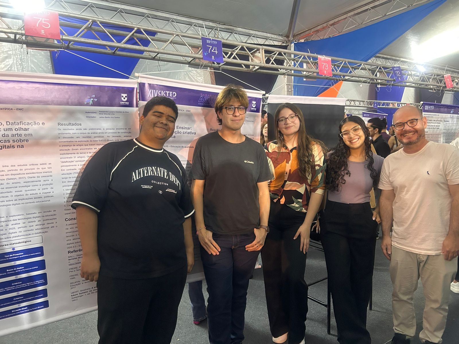 Ainda do curso de Licenciatura em Matemática, sob orientação do Prof. Me. Jailton Bartho dos Santos, alunos do 2º semestre marcaram presença na modalidade pôster. Emilly Aparecida do Amaral B. da Silva, Francisco Alves Fernandes e Maria Eduarda de Campos Santos apresentaram o trabalho “Criar, resistir, ensinar: a insubordinação criativa na matemática”, e Alessandro Luciano Deodato da Silva e Alice Silva de Lima apresentaram o trabalho “Plataformização, dataficação e práxis docente: um olhar sobre o estado da arte em pesquisas críticas sobre tecnologias digitais na educação”.