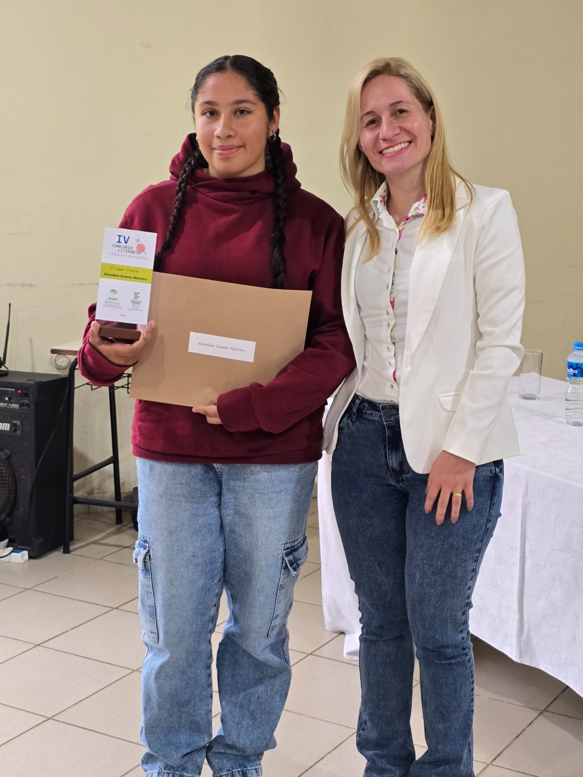 Foto 1 - Karoline Soares Martins recebe o prêmio de 1º lugar, entregue por Stefanie Martin, Diretora Adjunta de Ensino do IFSP-CJO.