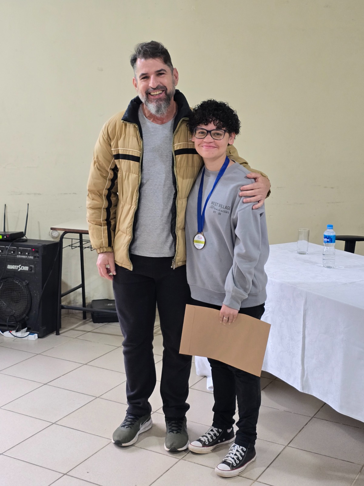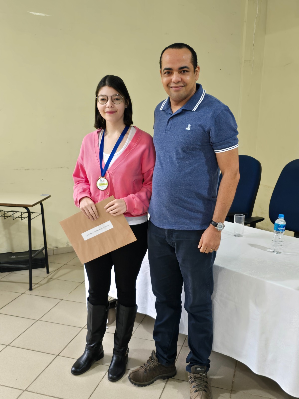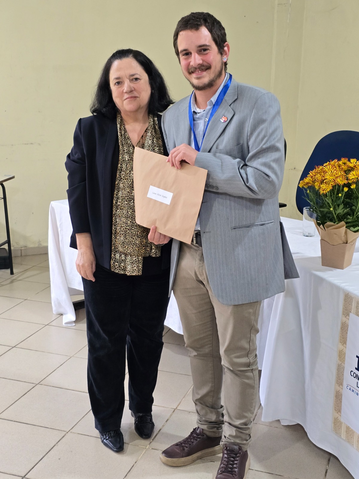 Foto 5 - Leon Ilitch Sopko recebe o prêmio de 2º lugar, entregue por Vera Lucia Villas Boas, Coordenadora da Biblioteca do IFSP-CJO.