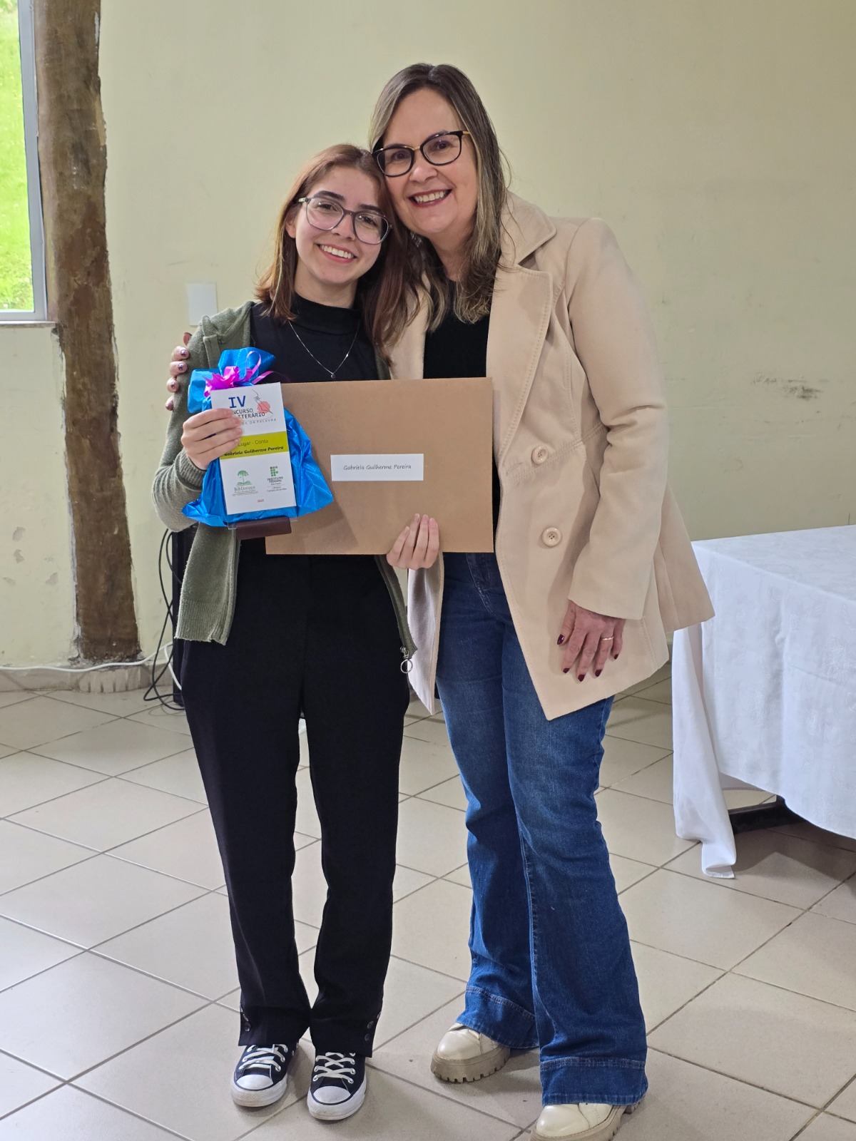 Foto 4 - Gabriela Guilherme Pereira recebe o prêmio de 1º lugar, entregue por Suzana Campana Peleteiro, docente do IFSP-CJO.