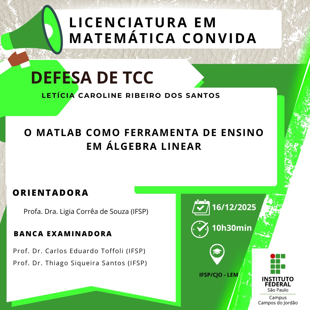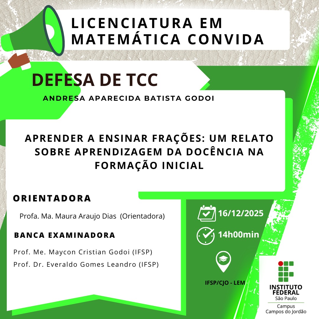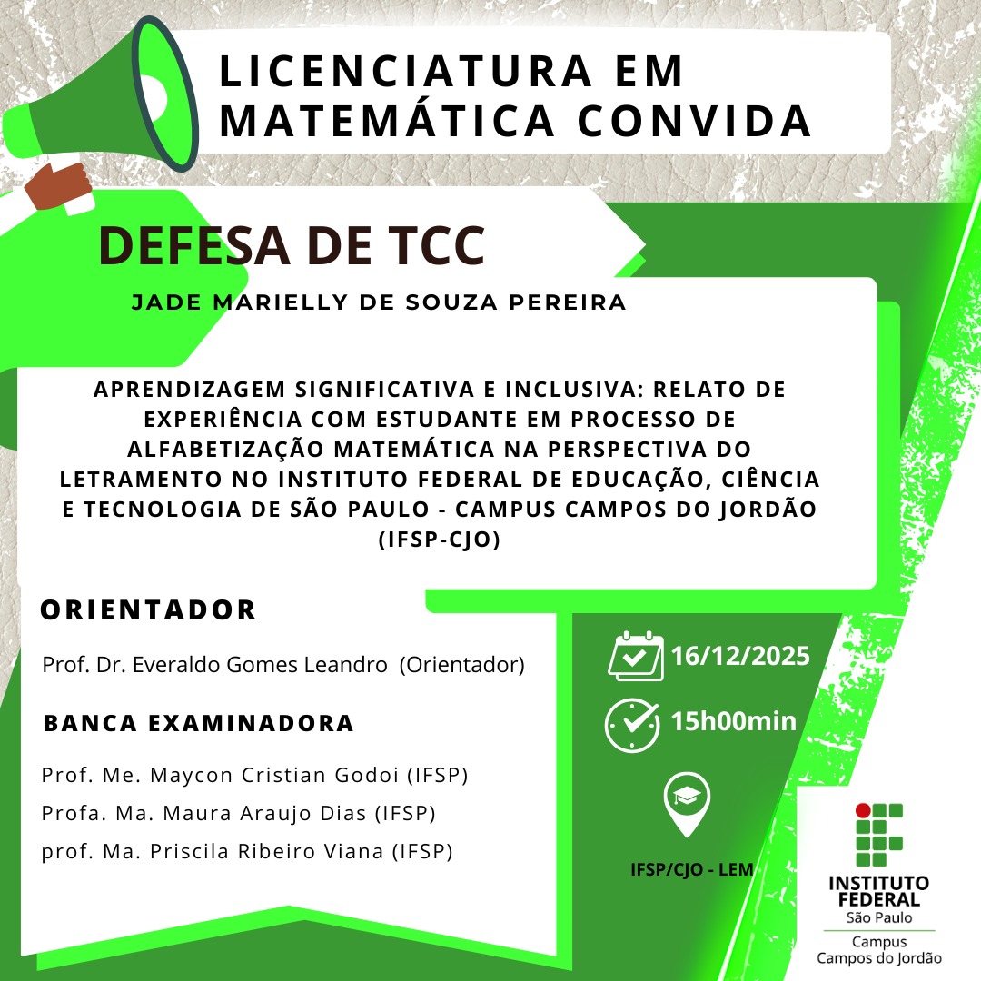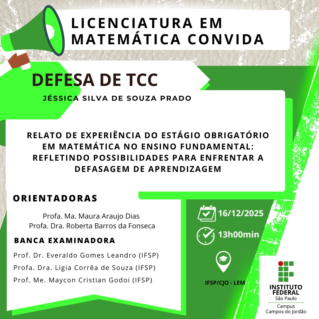 O Instituto Federal de São Paulo – Campus Campos do Jordão convida a comunidade acadêmica e o público interessado a acompanhar as Defesas de Trabalho de Conclusão de Curso (TCC) do curso de Licenciatura em Matemática, que ocorrerão no dia 16 de dezembro de 2025, no IFSP/CJO – LEM.